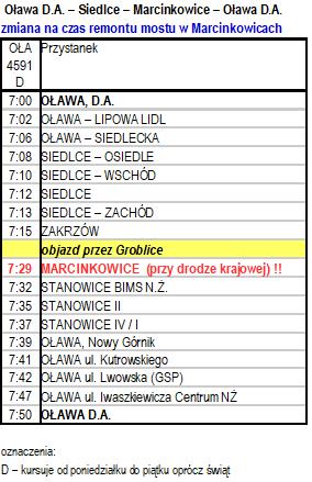 Z uwagi na dojazd uczniów do szkół, kurs o godz. 7:05 Oława – Siedlce – Zakrzów – Marcinkowice – Oława zostanie przyspieszony na godz. 7:00. Dodatkowo nie będzie dojeżdżał do przystanku Marcinkowice – szkoła tylko zatrzymywał się na przystanku przy drodze krajowej (poniżej zakładany rozkład tymczasowy)